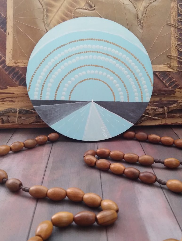 7 Gates est un talisman en acrylique peint sur un support MDF de 15cm, juste de quoi tenir dans la main. Il est disponible à l’adoption pour qui veut explorer ces portes si apaisantes.