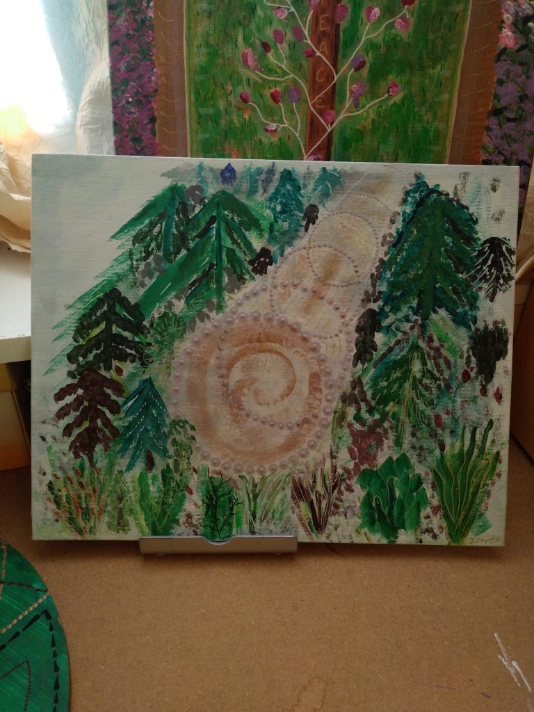 C’est ainsi que Portail dans les arbres a commencé. À ce moment là, l’idée de faire des talismans ou des supports de méditation n’est pas encore entré dans mon esprit. Je peins ce que je vois en vision. Puis, soudain, les choses s’accélèrent : je reçois l’oracle de la forêt sacrée de Denise Linn. Mes visions deviennent quotidiennes, et je découvre que chaque carte de cet oracle est un portail. Mon tableau s’agite et se modifie, il gagne en profondeur et devient… un portail actif.